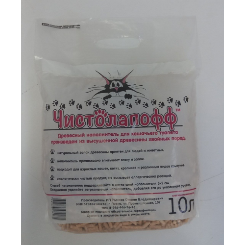 ЧИСТОЛАПОФФ – впитывающий наполнитель для кошачьего туалета. Произведен из высушенной древесины хвойных пород. Прессованные древесные гранулы отлично впитывают жидкость и являются надежным барьером от появляения неприятных запахов. Наполнитель безопасен для питомцев, является экологически чистым. Имеет приятный легкий аромат хвои. Идеально подходит для использования в качестве наполнителя для кошачьего туалета и подстилки для кроликов, хомячков, морских свинок, мышей и других мелких домашних любимцев.