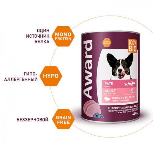 AWARD паштет из индейки с черникой для взрослых собак, 400 г